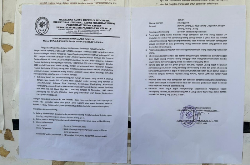 PENGUMUMAN PERTAMA LELANG EKSEKUSI Nomor 1/Del.Sita Eks/2022/PN Pdl jo. Nomor 67/Pdt.Eks/2019/PN Btm jo. Nomor 21/Pdt.GS/2019/PN Btm